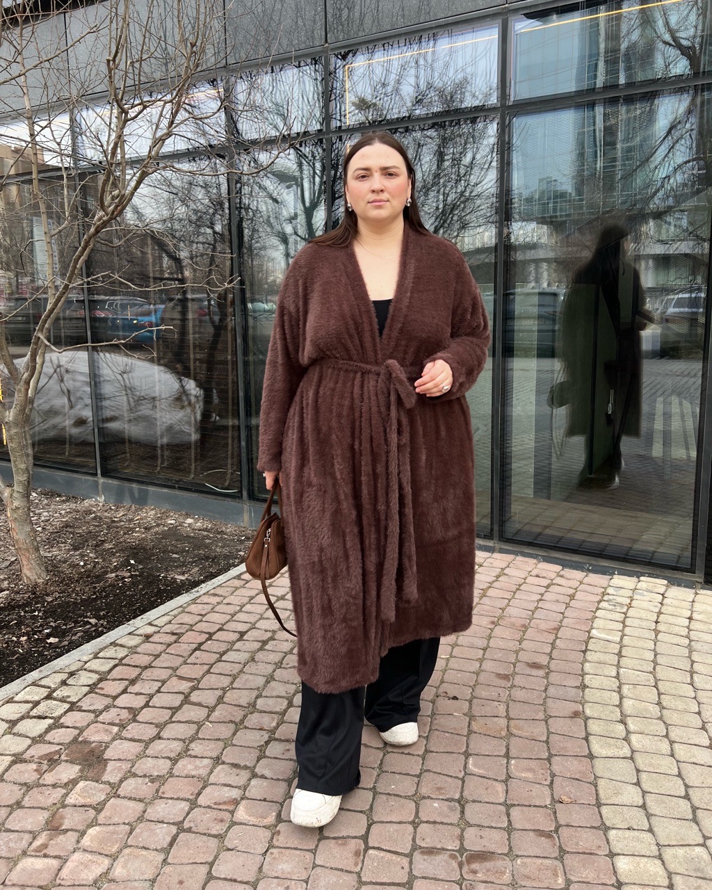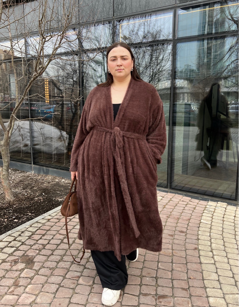 Кардиган из трикотажа с ворсом со спущенным плечом в размере Onesize. Пояс в комплекте. Боковые карманы.