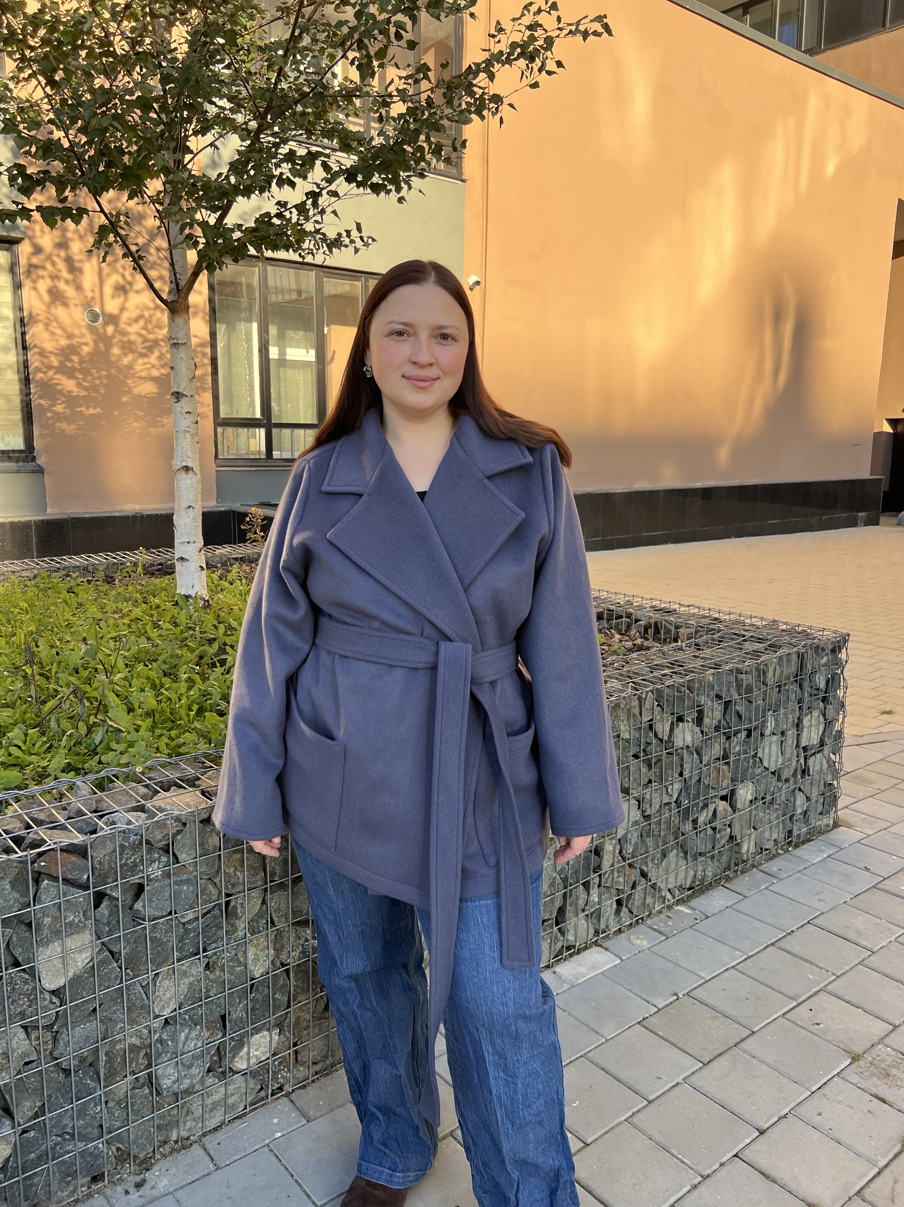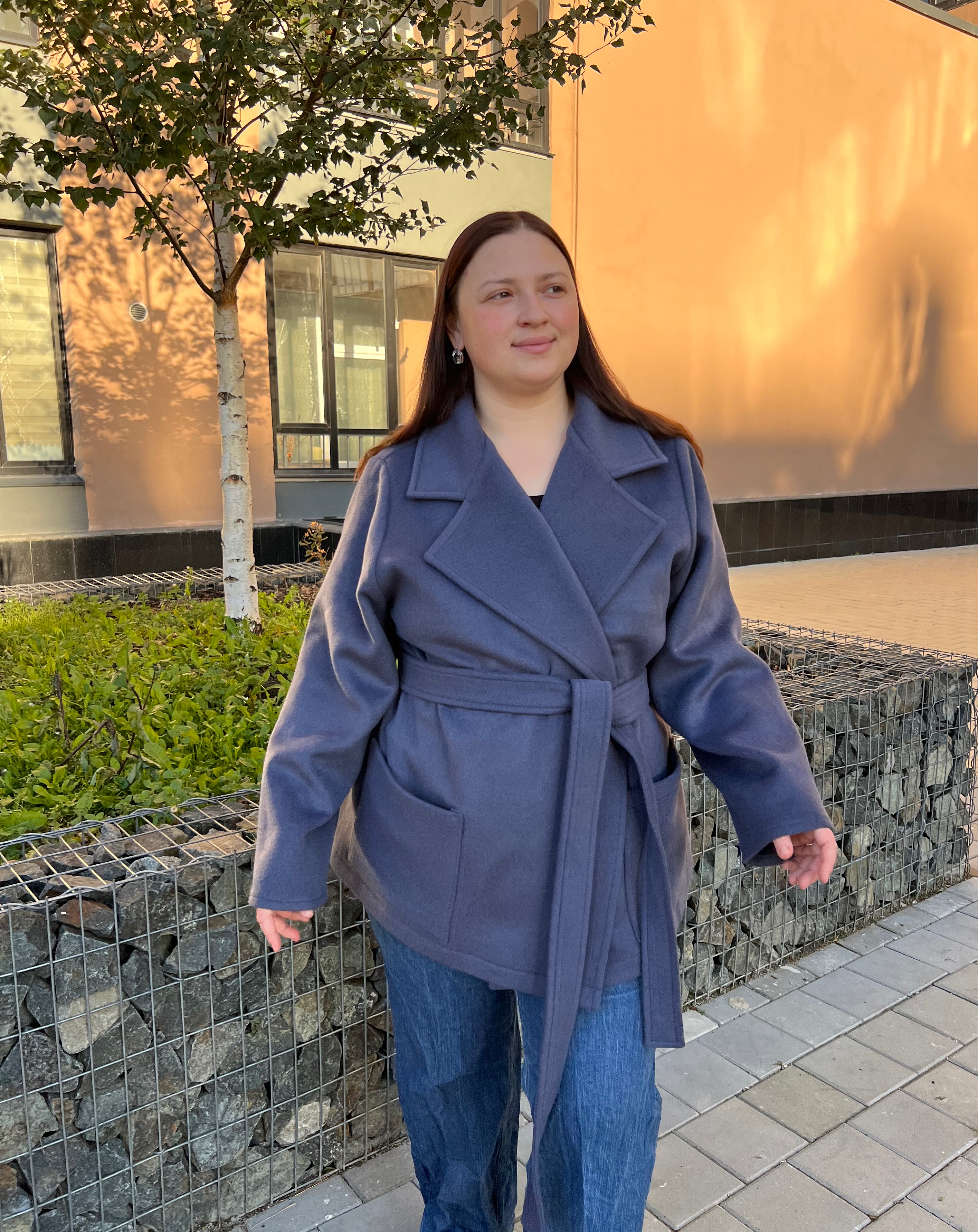 Пальто-пиджак с классическим английским воротником. Без подклада. Подборт и воротник дублированны. Втачной рукав без подплечников.Накладные карманы. На запах, пояс в комплекте. Шлевки по бокам. Кнопки идут в комплекте для самостоятельного пришивания.